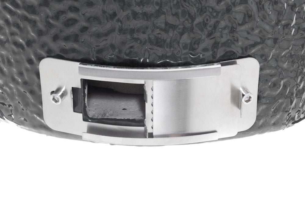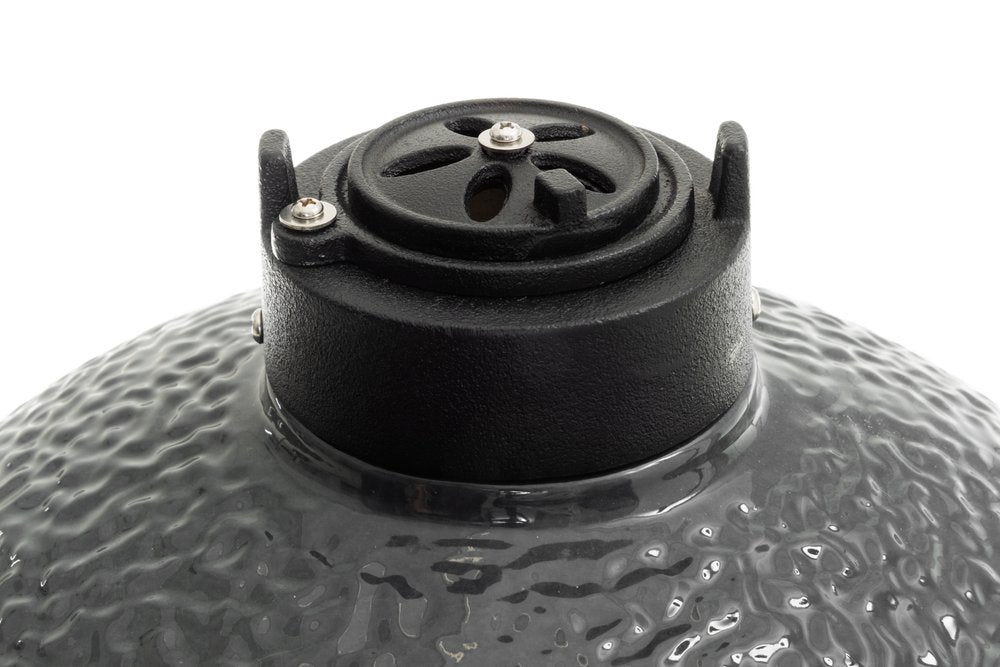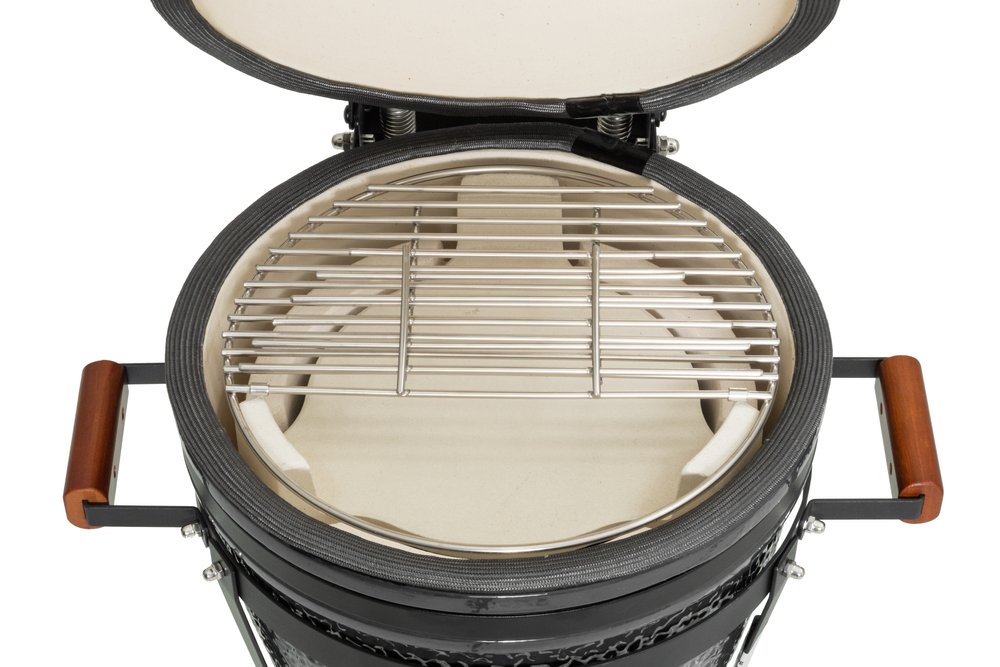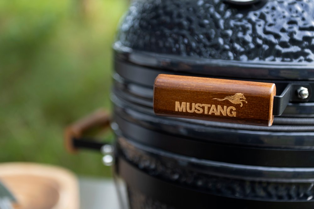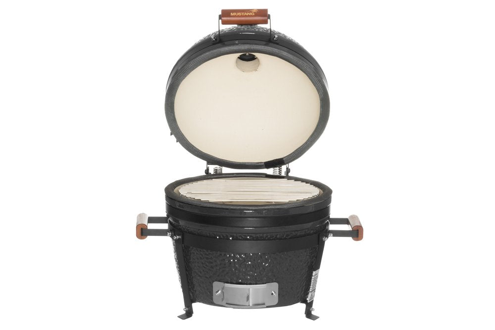 Keraaminen kamado 16" hiiligrilli pitkään grillaamiseen matalissa lämmöissä. Grillausritilä Ø 32,5 cm 304 ruostumattomasta teräksestä. Hiiliritilä valurautaa. Uusi Mullite keraaminen savi 1000 asteen lämmönkestolla. Valurautainen pääliventtiili todella tarkkaan vedonsäätöön. Alaventtiili suojaverkolla, jonka kautta lisää ilmaa hiilille. Kannessa ja tulipesässä laadukas lasikuitutiiviste metalliverkolla. Mustang logo kannen kahvassa. Kahva lämpökäsiteltyä bambua. Sisältää pöytätelineen, keraamisen lämmönjakolevyn kolmella jalalla ja hiilihangon tuhkanpoistoon.