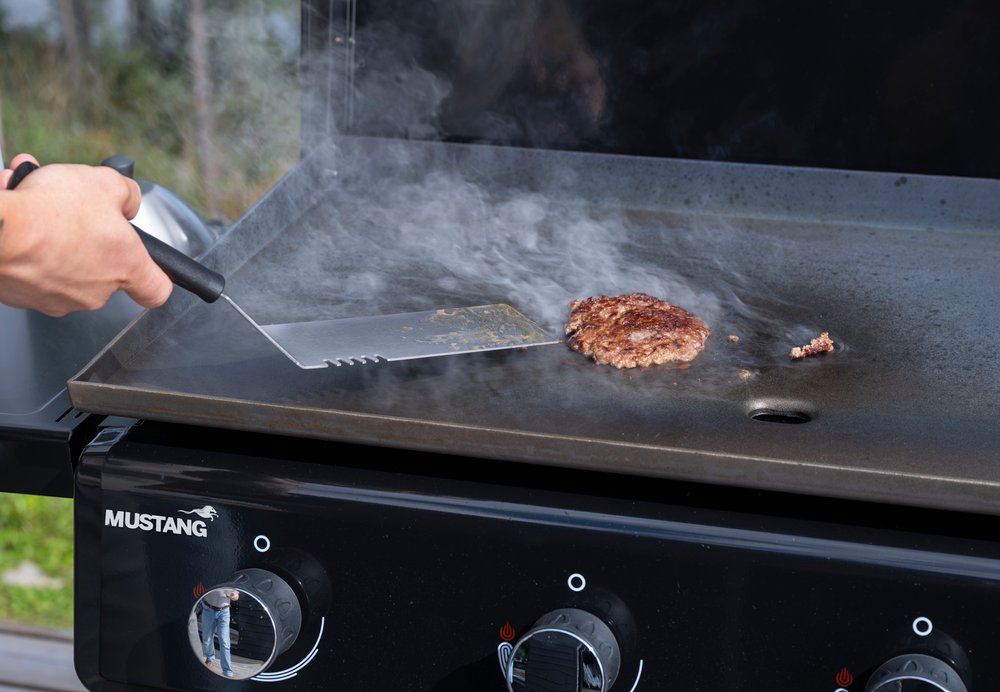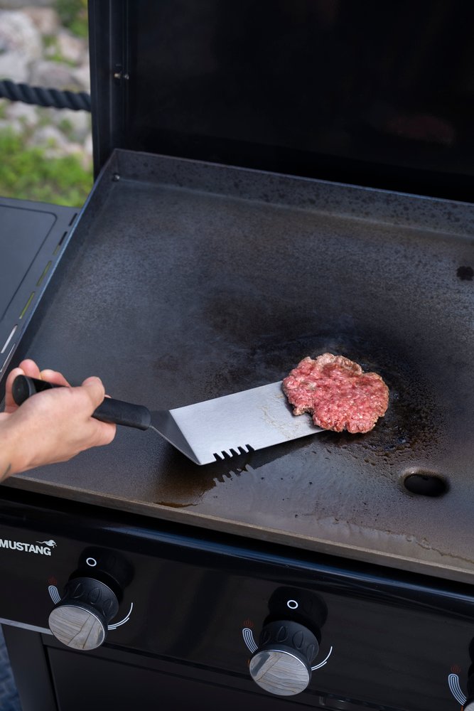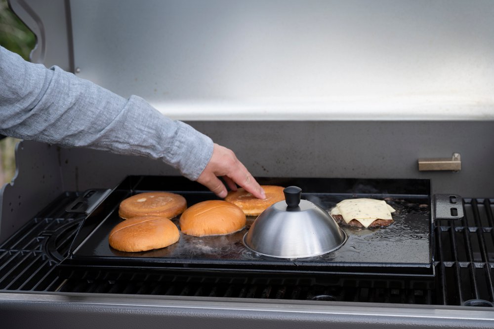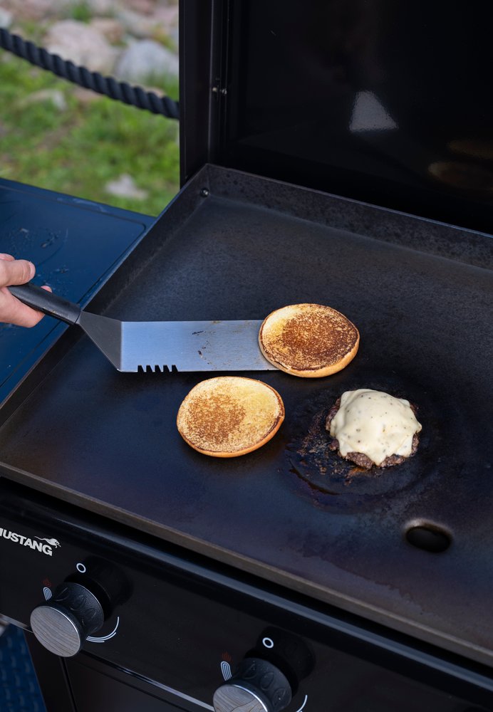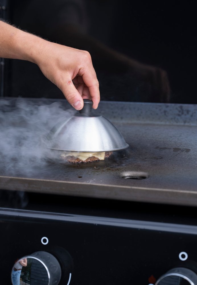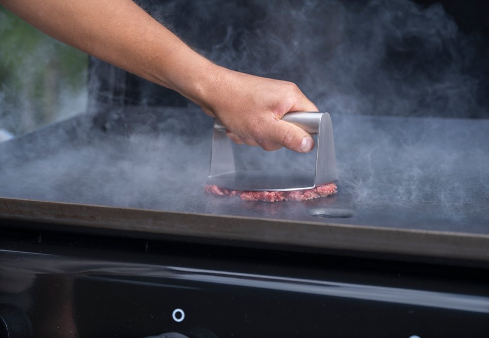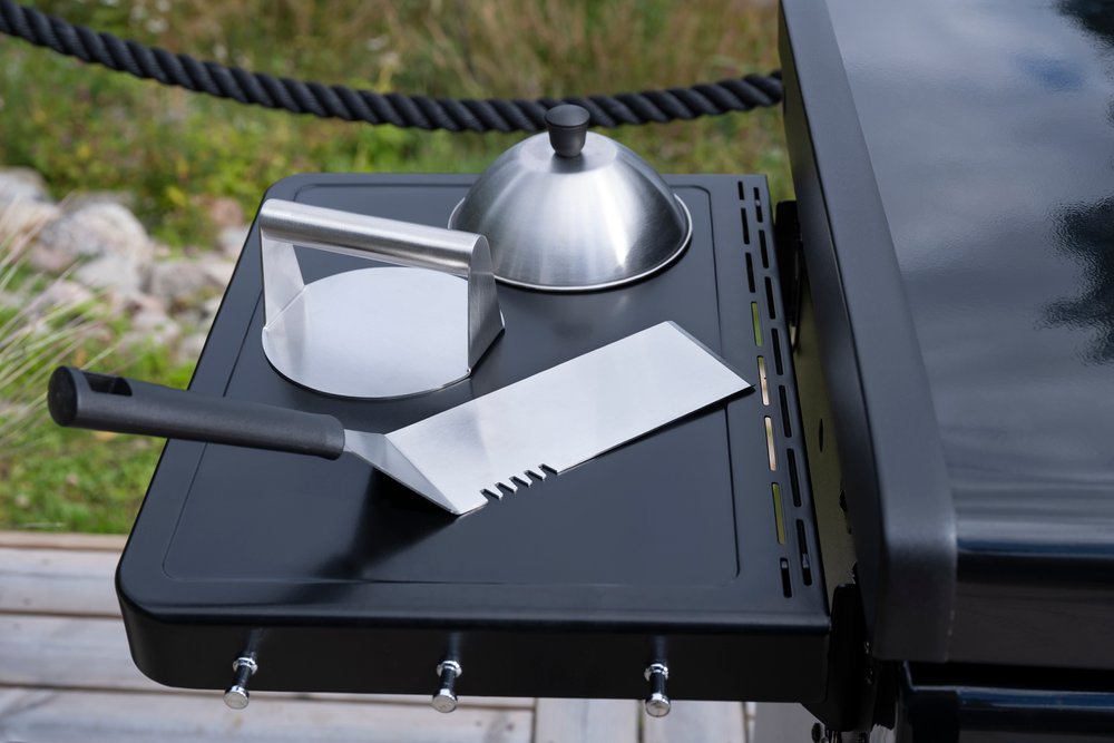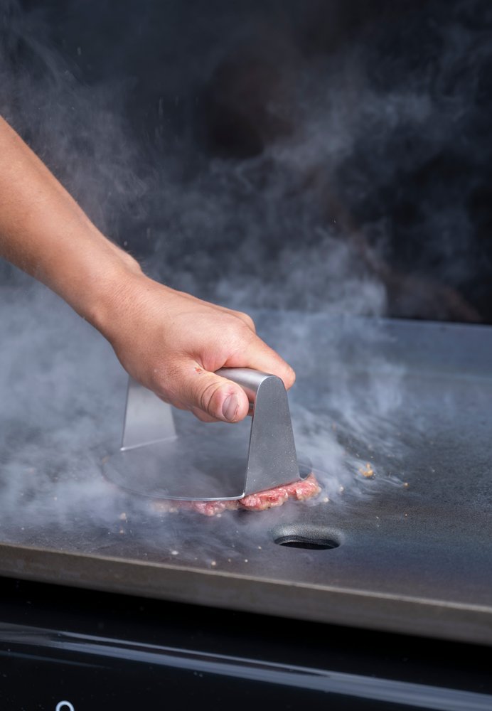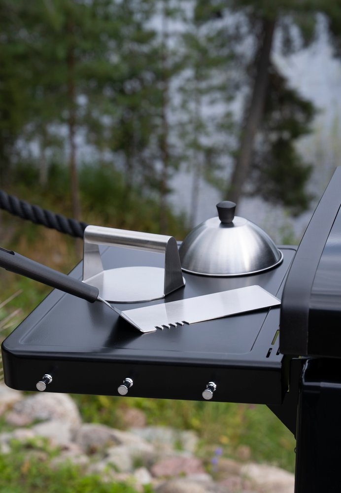Grillausvälinesarja smash burgereiden valmistamiseen. Setti sisältää leveän grillilastan, jykevän grillauspainon ja kätevän grillauskuvun. Grillauspainolla painat hampurilaispihvin ohueksi. Kuvun avulla juusto sulaa nopeasti hampirilaispihvin päälle.