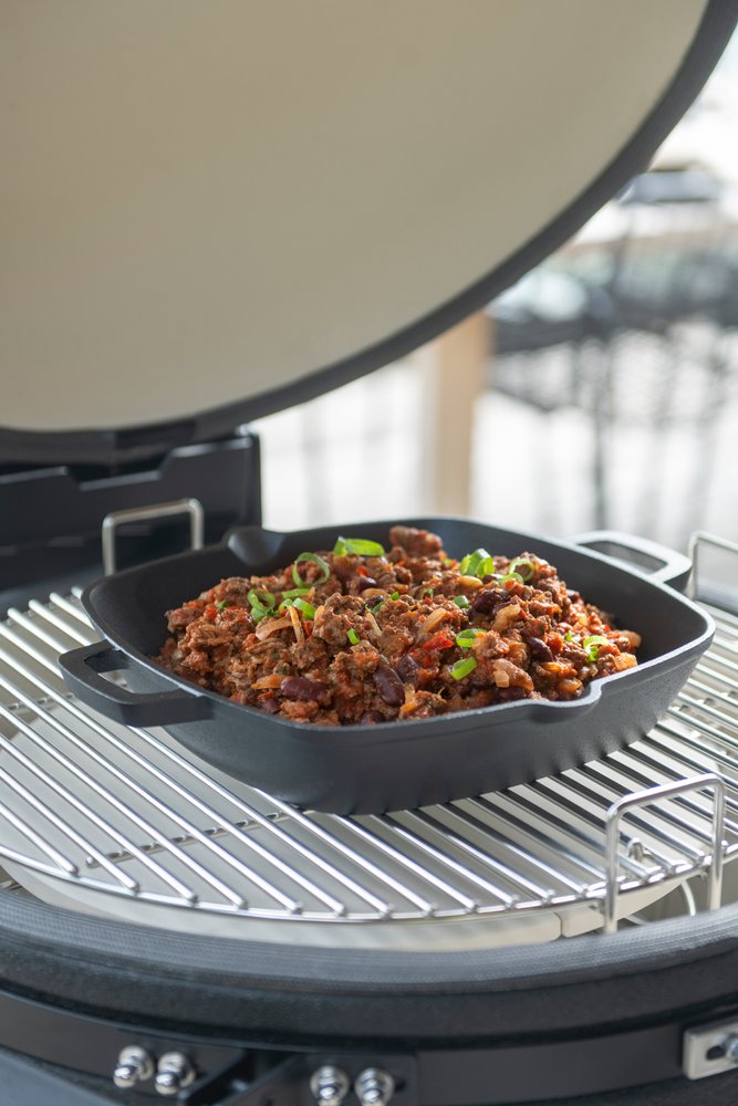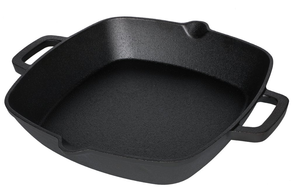 Neliönmuotoinen valurautapannu grilliin taikka keittiöön. Kaksi kiinteää kädensijaa ja kaksi kaatonokkaa. Koko 26 x 26 cm.
